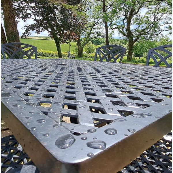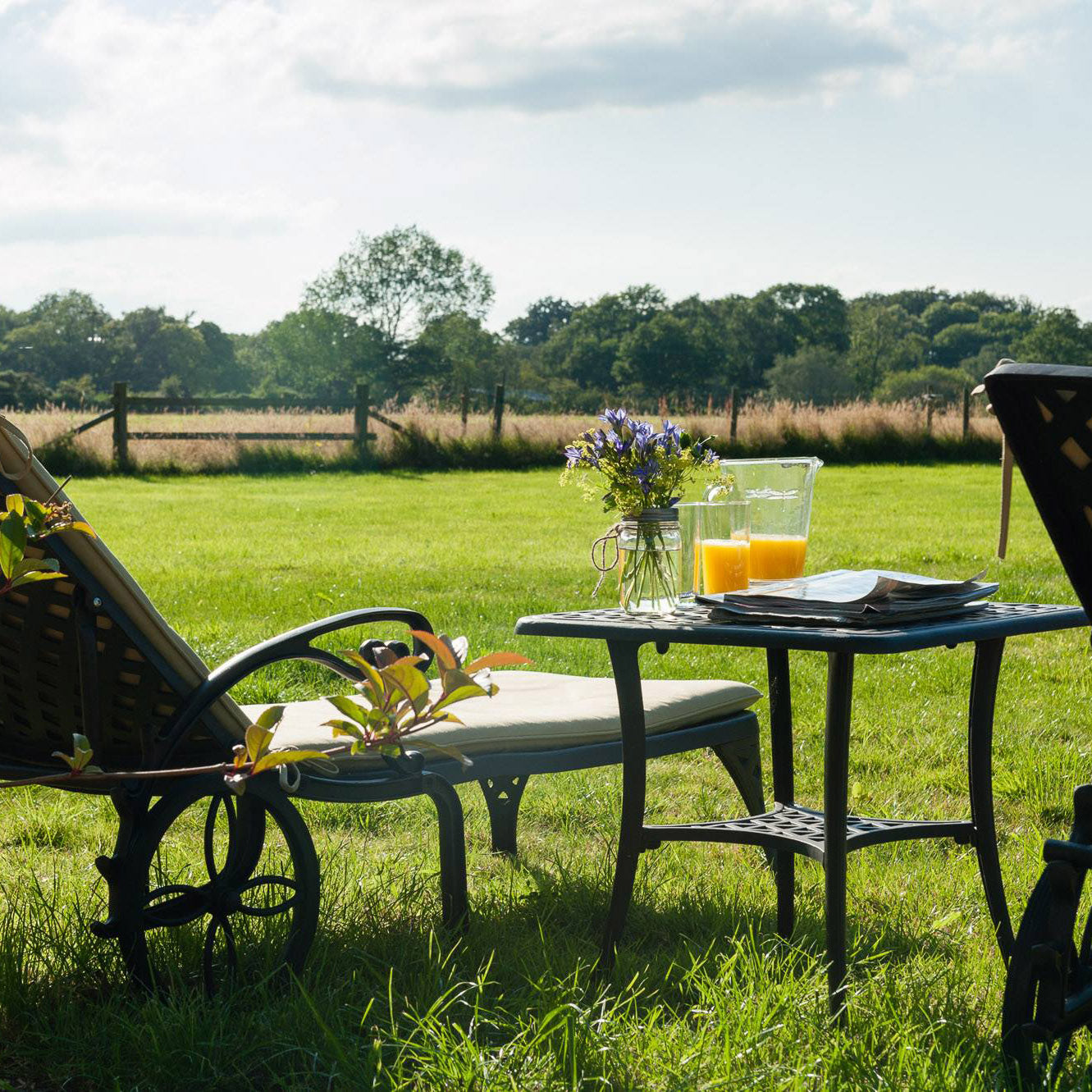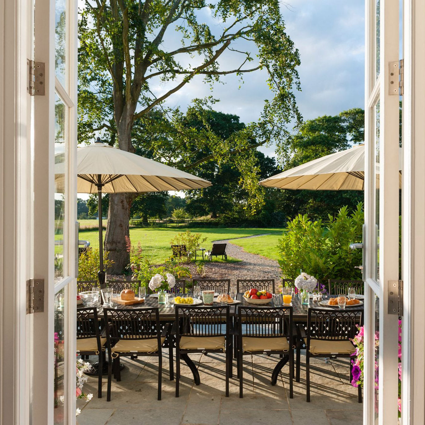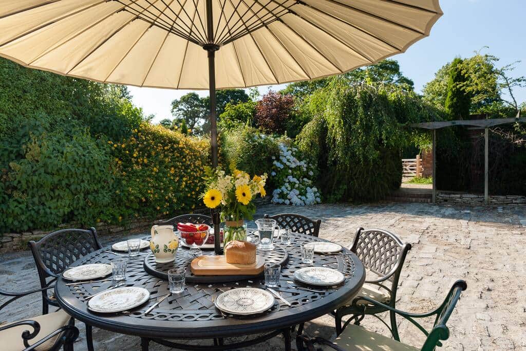 Products you’ll find here: The Rosemary Table with Lazy Susan, Parasol and April Chairs in Antique Bronze.