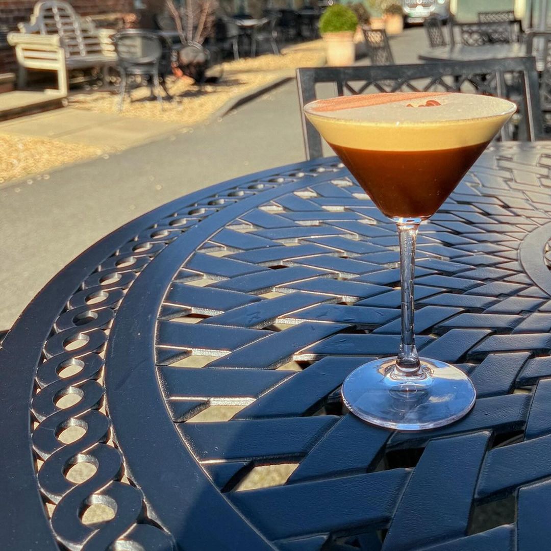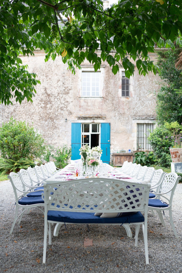 Producten die u hier ziet: Madison-tafels en Kate-stoelen in wit, evenals een eerder model van onze Stella-ligstoel in Antiek Brons.