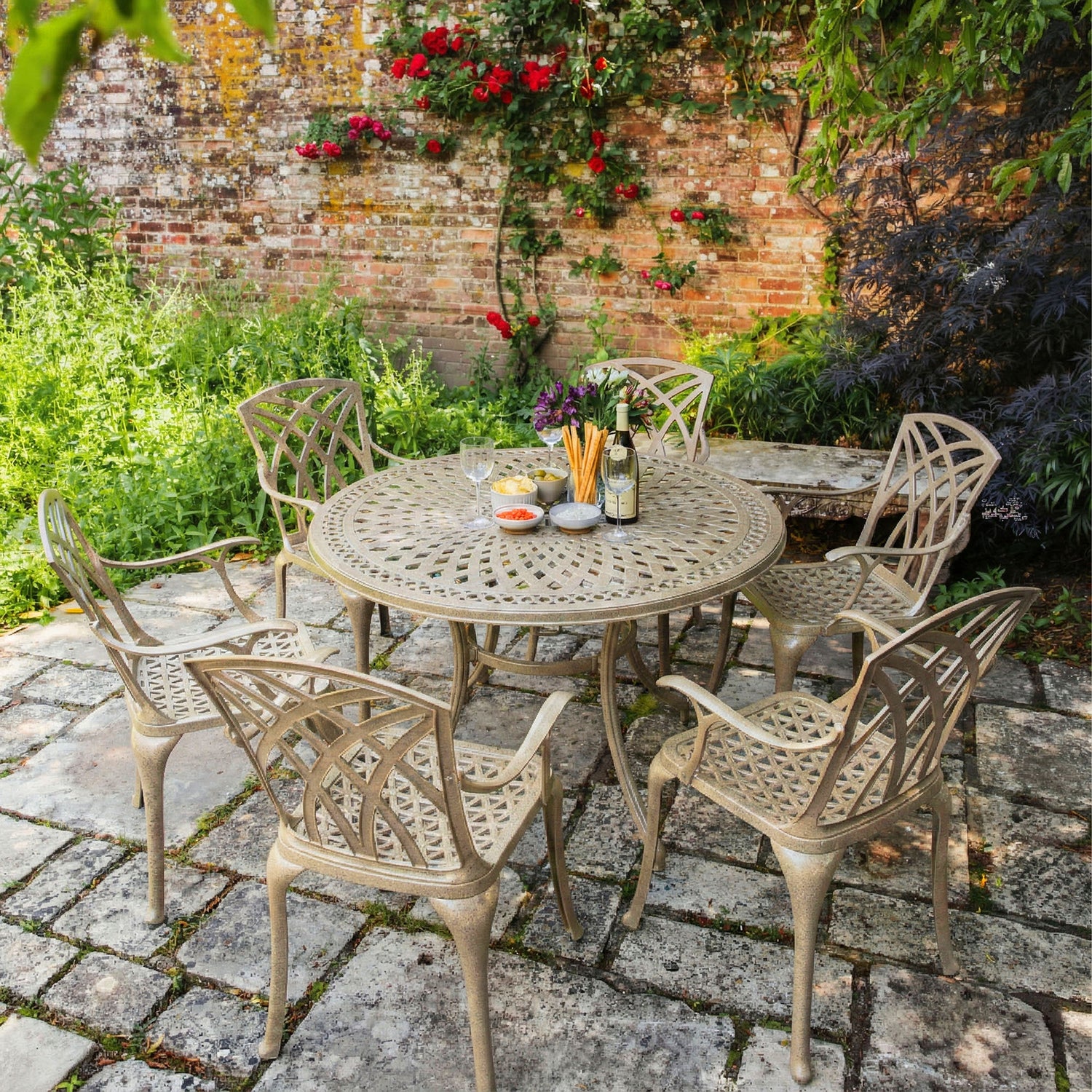 De Alice 6 persoons tafel is erg geliefd bij onze klanten en met meer dan 50 positieve beoordelingen een bestseller 6 persoons ronde Zandsteen metalen tuinmeubel set. Je kunt ook een paar prachtige foto's bekijken die onze lieve klanten hebben ingezonden van deze mooie tafel in de bovenstaande galerij. De Alice 6 persoons tafel set is de perfect maat voor kleine bijeenkomsten zoals BBQs en feestjes of om gewoon even een ontspannende avond te hebben buiten in de zomerzon. De tafel is gemaakt van een hoge kwaliteit onderhoudsvrij aluminium en zelf na vele jaren zal het net zo mooi zijn als de dag dat je het kocht.