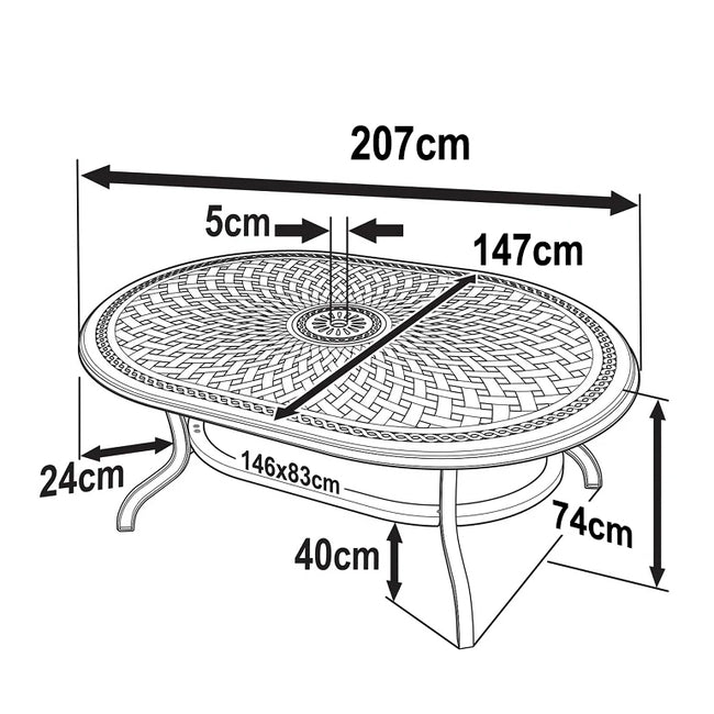 De Rosemary is een grote ovaalvormige tafel voor 8 personen, perfect om te genieten van een familie lunch in de zon of super etentjes en feestjes. Personaliseer je keuze door te kiezen uit 5 verschillende ontwerpen van stoelen om een stukje tuin te maken waarop je fier bent. Je kunt kiezen uit 4 verschillende kleuren parasols en kussens. Gemaakt van gegoten aluminium, zal het nooit roesten en nooit verrotten.