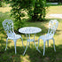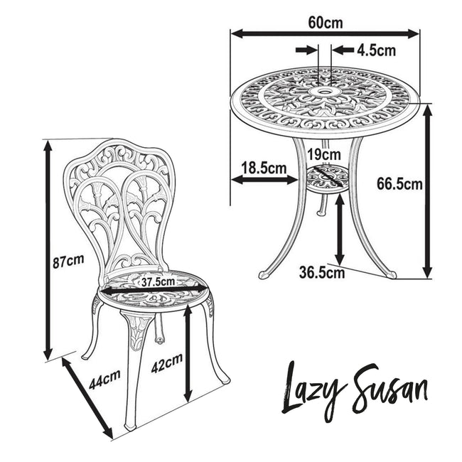 Met een gewicht van 5 kg en een diameter van 60 cm, de Tulip bistrotafel wordt geleverd met twee bijpassende bistrostoelen. Gemaakt van hoogwaardig zandgegoten aluminium en afgewerkt in het klassiek Wit, deze elegante set is volledig roestvrij en weerbestendig. Het biedt ook een vleugje klassieke schoonheid die elke tuin, binnenplaats of balkon onmiddellijk beter maakt. Geniet van vele romantische al fresco etentjes en een drankje met de Tupil Bistro set of als je iets groter nodig hebt bekijk dan als alternatief onze best verkopende Alice of Mia 4 persoons sets.